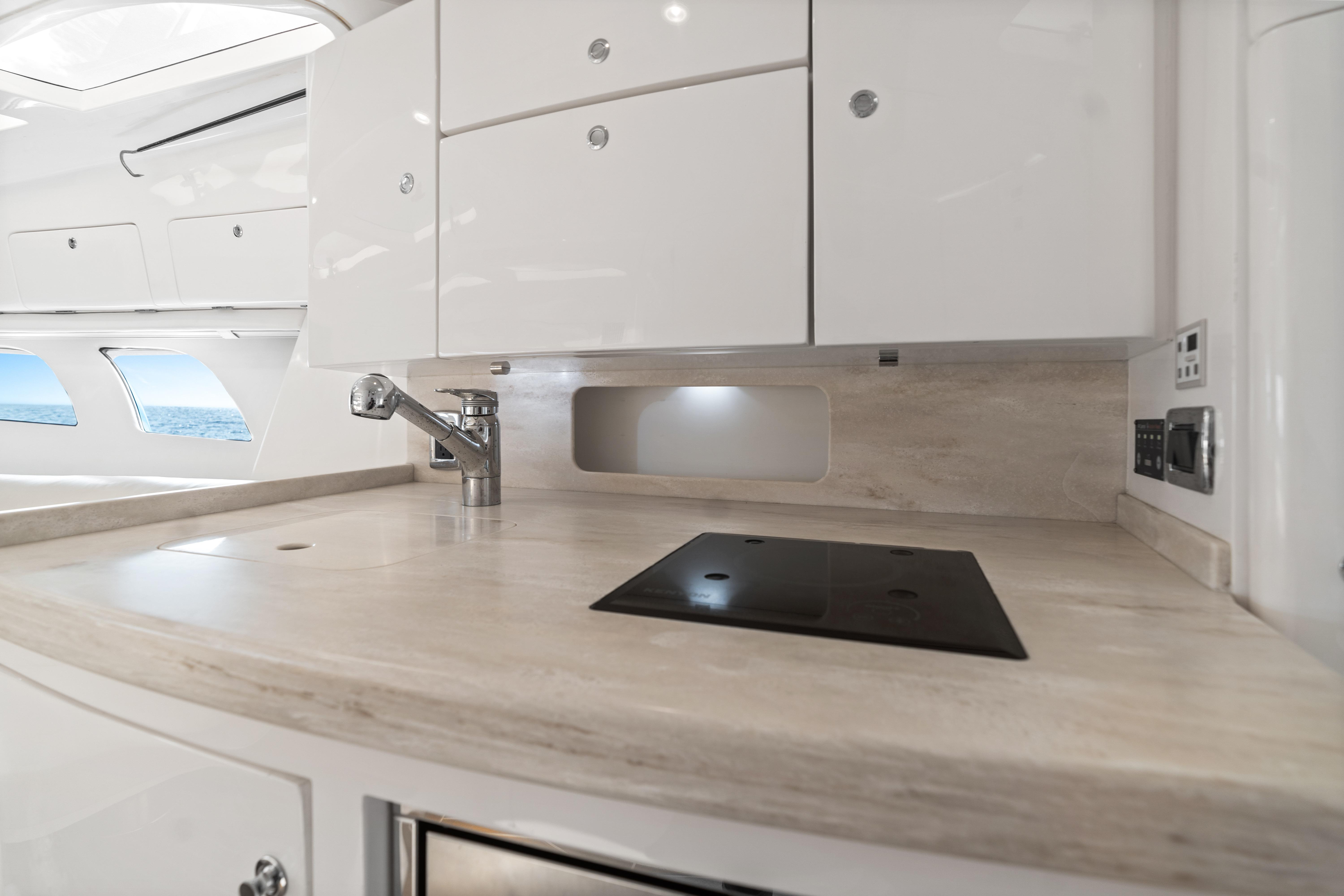 Well equipped galley featuring refrigerator, cooktop & microwave